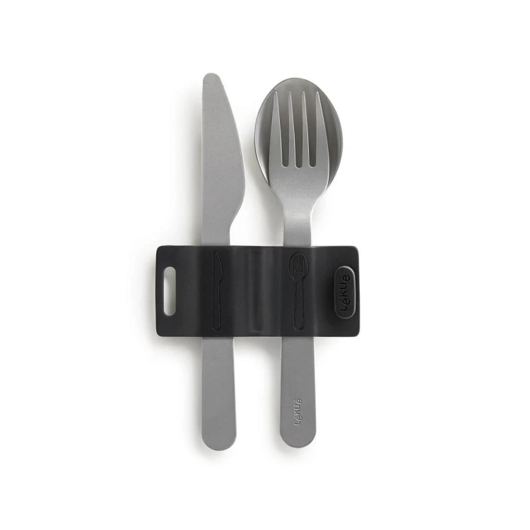 Компактен комплект от трите основни прибори от неръждаема стомана, пригоден за удобно пренасяне при хранене извън дома.
