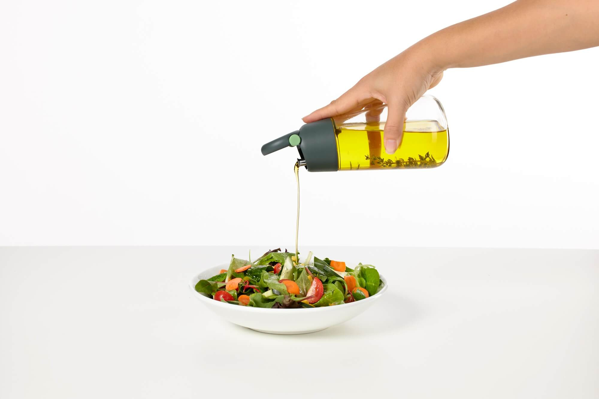 Със системата за постепенно изливане , която ви дава по-добър контрол върху количеството изтичаща течност според вашите нужди: независимо дали подправяте салата, препичате филийка или дори пържите.