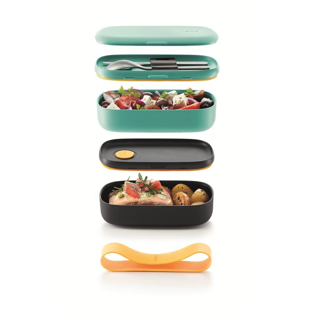 Описание: Всяка от кутиите е с идеален размер за една порция, специално проектирани за да се насладите безгрижно на ястията, който сте си приготвили. 100% херметическо затвареня Комплект, състоящ се от 2 контейнера, свързани със силиконова лента за по-лесно транспортиране. Вграден клапан на капака на всяка кутия, който гарантира безопасна употреба в микровълнова печка. Уникален дизайн със специално обособена горна част за съхранение на приборите, като ги поддържа чисти и добре подредени (приборите не са включени в комплекта, могат да бъдат закупени отделно под артикулен номер 1010231). Ограничете употребата на преработени храни, пренасяни и съхранявани в пластмасови съдове за еднократна употреба. Размери на 1 кутия: 19.5x10xH7cm Размери на комплекта: 19.5x11xH10.7cm Вместимост на 1 кутия: 500ml Устойчивост на температури в диапазона -20°C / +100°C. Подходящ за почистване в съдомиялна Изработен от полипропилен Гаранция за физически лица: 5 години