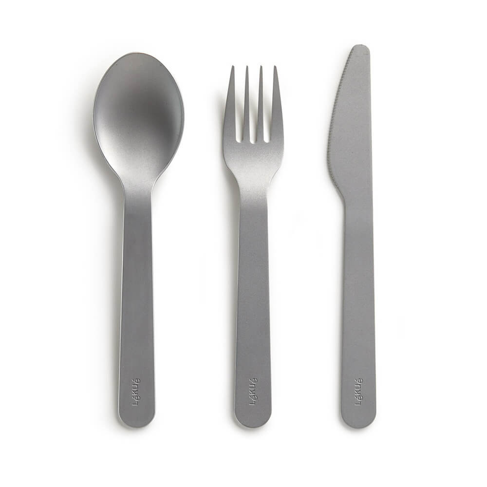 Компактен комплект от трите основни прибори от неръждаема стомана, пригоден за удобно пренасяне при хранене извън дома.