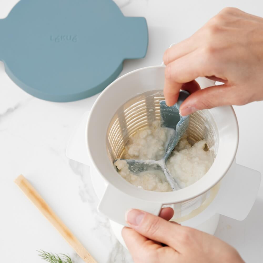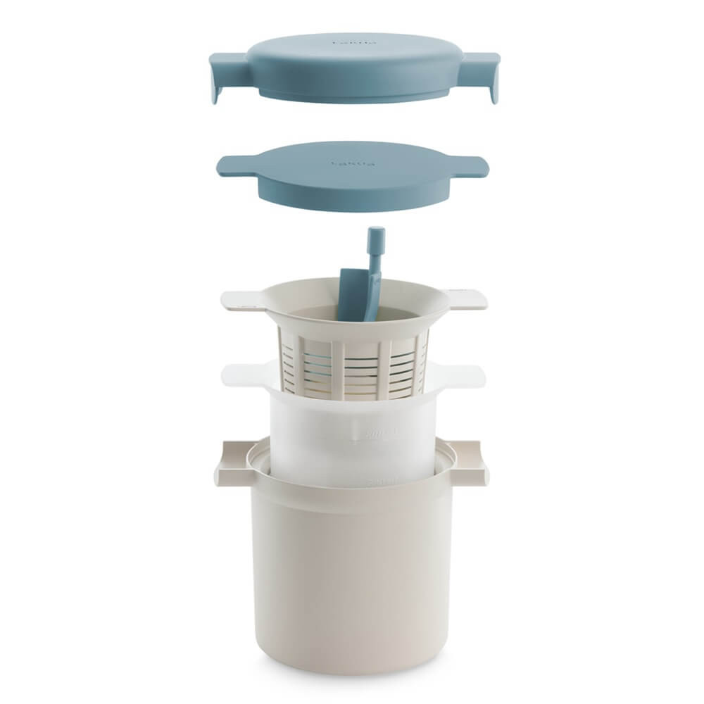 Можете да извършите целия процес само с помощта на аксесоарите включени в този комплект: загряване на млякото, ферментация, филтриране на гранулите и дори съхранение на крайния продукт.