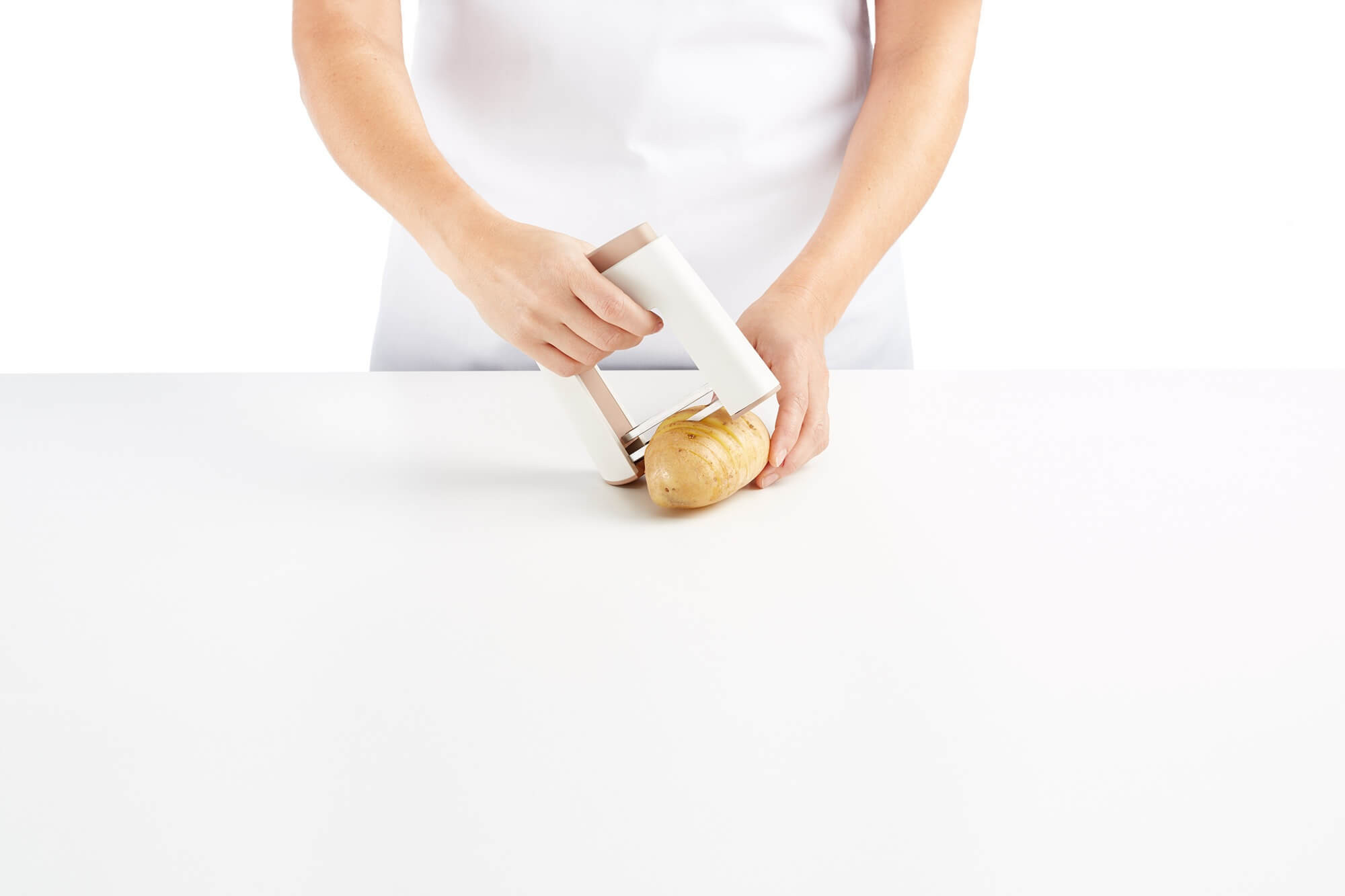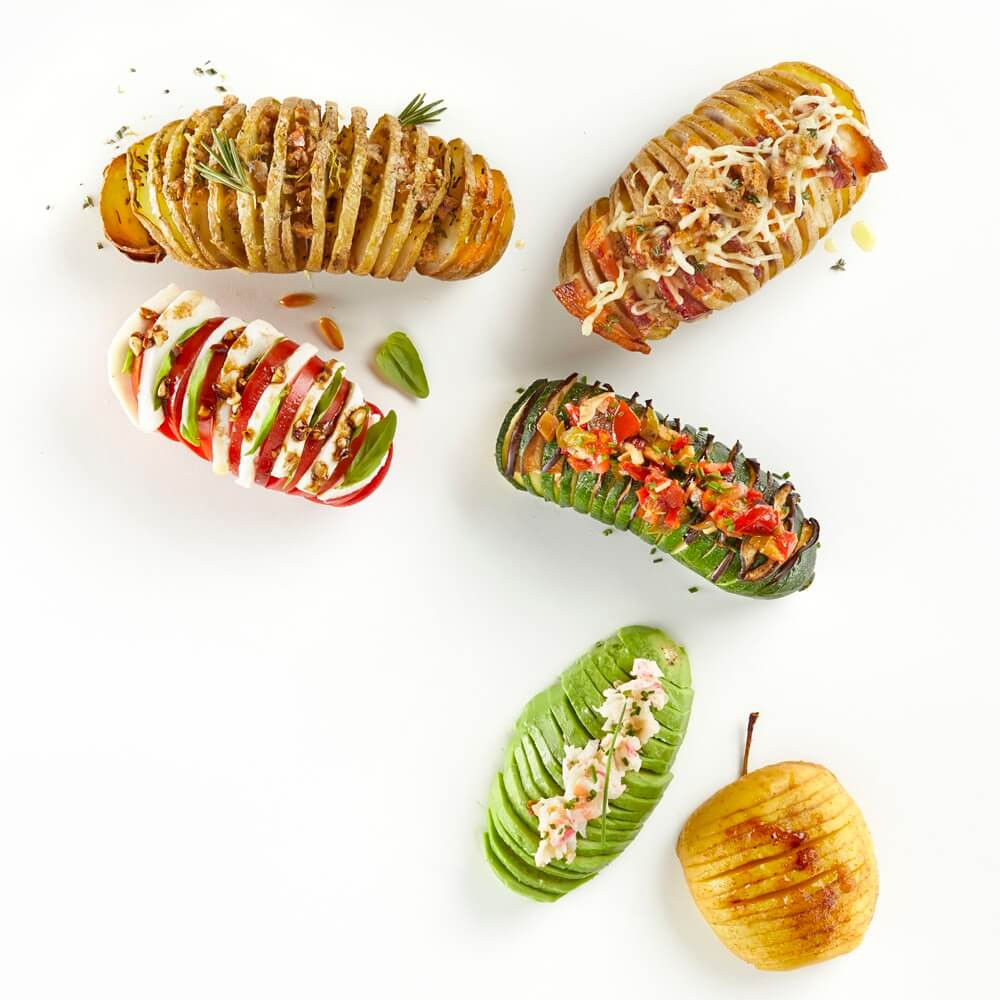 Нарежете зеленчуци на ветрило с уреда на Lekue за по-хрупкава и вкусна алтернатива на обикновените печени във фирна или на скара зеленчуци. Здравословна гарнитура за миг!